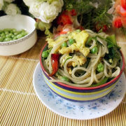 米粉、鸡蛋、菠菜、小白菜、豌豆、豌豆嫩荚、葱片、干辣椒、食用油、盐、糖、生抽、香油。