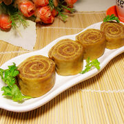 豆腐皮、猪肉馅、葱末、姜末、水淀粉、盐、糖、五香粉、豆瓣酱、香油、料酒、鸡精、白胡椒粉、酱油。
