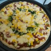 高粉、水、披萨酱、玉米粒、西兰花、培根、香肠、马苏里拉奶酪、酵母、橄榄油。