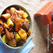 牛蹄筋、土豆、莴笋、香菇、洋葱、葱、姜、蒜、大料、山楂片、老骨汤、米酒、花椒、干辣椒。