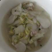 年糕、里脊肉、娃娃菜、葱、笋干、盐、鸡精、食用油、白胡椒粉。