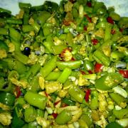 长豆角、猪肉、青辣椒、大蒜、蚝油、油、盐。