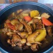 三黄鸡、土豆、红辣椒、青辣椒、花椒、八角、大葱、大蒜、生姜、胡萝卜、西红柿、盐、糖、啤酒、酱油。