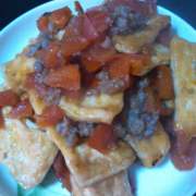 老豆腐、肉末、西红柿、盐、糖、生抽。