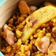 鸡脯肉、洋葱、大米、蒜、香蕉、咖喱粉、橄榄油、鸡汤、盐、白胡椒粉。