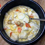 豆腐、鸡蛋黄、咸蛋黄、胡萝卜丁、干贝、蒜泥、牛奶、水淀粉、鸡精、盐、高汤精。