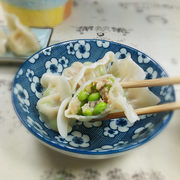 青豆、猪肉末、饺子皮、盐、姜末、五香粉、白胡椒粉、淀粉、花椒油。