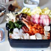 五花肉、豆腐、大虾、金针菇、蟹味菇、香菇、海带、魔芋丝、年糕片、白菜心。
