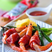 大虾、培根、芦笋、盐、黑胡椒粉、料酒、食用油、亨氏番茄酱、白砂糖、盐、香油、清水。
