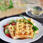 面粉、牛奶、鸡蛋、培根、切达干酪。