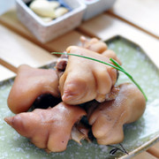 猪蹄、油醋蒜泥汁、辣椒酱、酱油辣根、葱姜、香料包、黑胡椒粒、香糟卤汁、糖、盐。