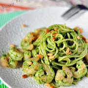 意面、虾仁、松仁、新鲜罗勒、松仁、大蒜、特级初榨橄榄油、海盐。