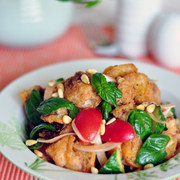 隔夜剩面包、黄瓜、西红柿、洋葱、大蒜、干果、橄榄油、意大利葡萄醋、海盐、胡椒粉。
