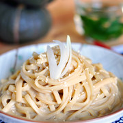 乌冬面、芝麻酱、白洋葱、熟芝麻粒、大蒜、日式酱油、芝麻香油、米醋、橄榄油、盐。
