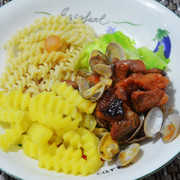 猪颈肉、蛤蜊、圆葱、奥尔良烤肉料、海鲜酱、旧庄蚝油、味达美酱油。