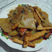 素鸡、土豆、油、盐、花椒粉、酱油、葱、蒜、鸡精。