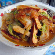 白菜、素鸡、西红柿、油、盐、花椒粉、白糖、酱油、葱、鸡精。