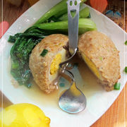 五花肉、里脊肉、荸荠、生鸡蛋、熟鸡蛋、小青菜、蒜、葱、精制淀粉、料酒、味极鲜生抽。