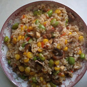 米饭、甜玉米粒、青毛豆粒、胡萝卜丁、猪里脊肉、香菇丁、豆干丁、葱花、食用油、食用盐。