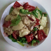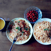 意粉、肉馅、番茄、洋葱、蒜、豌豆、黑胡椒碎、食盐、番茄酱、罗勒叶。