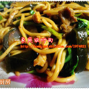 面条、肉丝、青椒、海带、洋葱、小青菜、葱花。