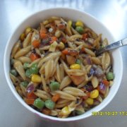 面、胡萝卜、豌豆、玉米粒、香肠、蒜、洋葱、熟芝麻、蚝油、酱油、盐、糖、菜油、香油。