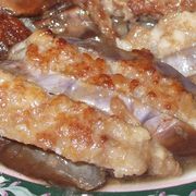 茄子、五花肉、瑶柱、大蒜头、生粉、生抽、糖、油。