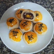 低粉、猪油、细砂糖、清水、低粉、猪油、红豆沙、咸蛋黄、鸡蛋黄液、黑芝麻。