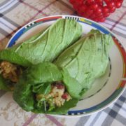 米饭、土豆、白菜叶子、花生米、豆瓣酱、鱼子酱、葱、香菜、黄瓜、盐。