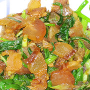 五花肉、姜片、花生油、嫩韭菜、生菜、生抽、COOK100蒜香烧烤酱。