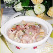 干鱿鱼、排骨、粳米、香芹、香豆腐粒、姜末、精盐、鸡精、胡椒粉、冬菜、 食用油。