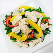 鲜鱿鱼、红黄彩椒、韭菜花、生抽、精盐、鸡精、食用油。