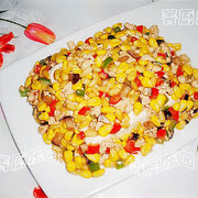 嫩豆腐、玉米、松仁、鸡胸肉、香菇、青柿子椒、红柿子椒、甜面酱、生抽、蒜末、姜末、蒜片、姜片、食用油、精盐、鸡精、白砂糖、水、淀粉。