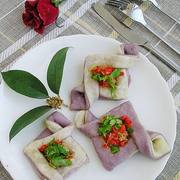 面粉、紫薯、鲜肉馅、发酵粉、食用碱、红甜椒、香菜。