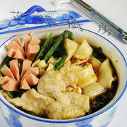 猪里脊肉、烩面片、青菜、香菜、熟花生、脆皮肠、火锅底料。