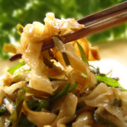 面筋丝、尖椒、油、糖、盐、鸡精、生抽、老抽。