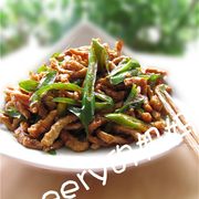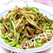 猪肉丝、茭白、毛豆米、青椒、葱、姜、糖、盐、鸡精、酒、酱油、生粉、油、水。