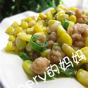 鲜玉米粒、猪肉泥、尖椒、油、糖、盐、酒、生粉、生抽、蚝油、葱姜、太太乐鲜鸡汁、水淀粉。