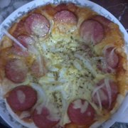 披萨胚、芝士碎、番茄沙司、腊肠、洋葱、披萨草。