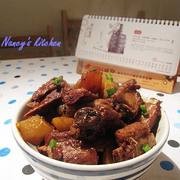 排骨、土豆、葱、姜、油、盐、白糖、老卤水、料酒、香醋。