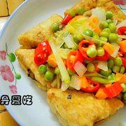 老豆腐、猪肉、红辣椒、胡萝卜、碗豆、洋葱、葱、姜、鸡蛋、盐、鸡精、糖、生粉、老抽、花椒粉。