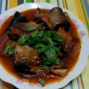 鱼头、猪五花肉、花椒、大料、姜、葱、香叶、料酒、酱油、糖、蒜、红干椒。