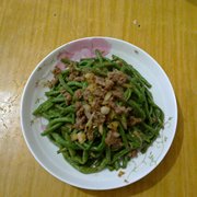 长豆角、瘦肉、蒜、小葱、盐、鸡精、醋、淀粉、油。