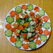 黄瓜、胡萝卜、鸡胸肉、盐、醋、鸡精、淀粉、食用油。
