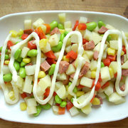 土豆、苹果、胡萝卜、素腊肠、玉米粒、青豆、丘比香甜沙拉酱。