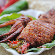 鱿鱼、金针菇、洋葱、青红椒、蜜汁烤肉酱、料酒、盐、生抽、油、孜然粉、姜。