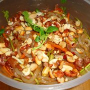 胡萝卜、粉条、蒜、香菜、熟花生碎、干辣椒、食用油、盐、酱油、醋、味精、白糖。