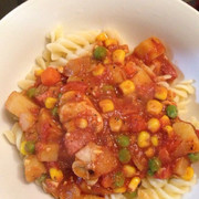 蘑菇、土豆、西红柿、洋葱、胡萝卜、玉米粒、青豆、香肠、通心粉、通心粉番茄酱。