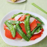 荷兰豆、胡萝卜、洋葱、植物油、盐、淀粉、蚝油、姜、味极鲜。