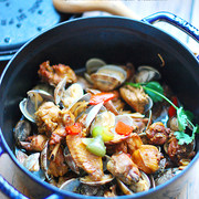 仔鸡、蛤蜊、葱姜、青椒、红尖椒、香菜、花椒、八角、盐、生抽、老抽、料酒。